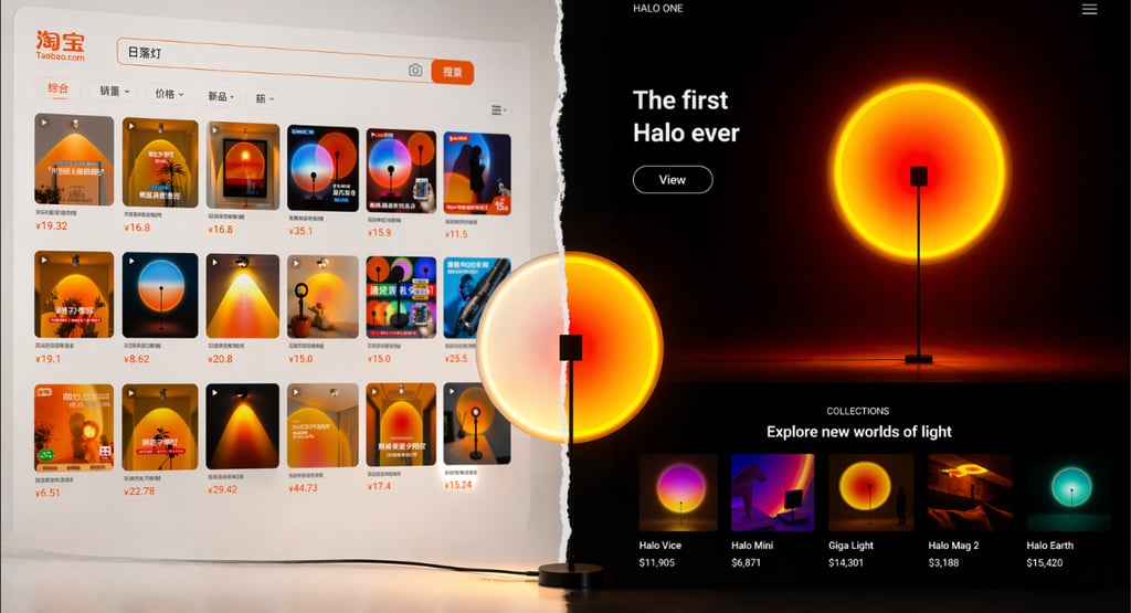 The HALO lamp makes this concrete. Designed in Italy. Manufactured in Italy. European supply chain throughout. Original retail price over $1,500. Within two years of launch, copies appeared on Chinese platforms. By 2021, the cheapest versions were listed at $2.